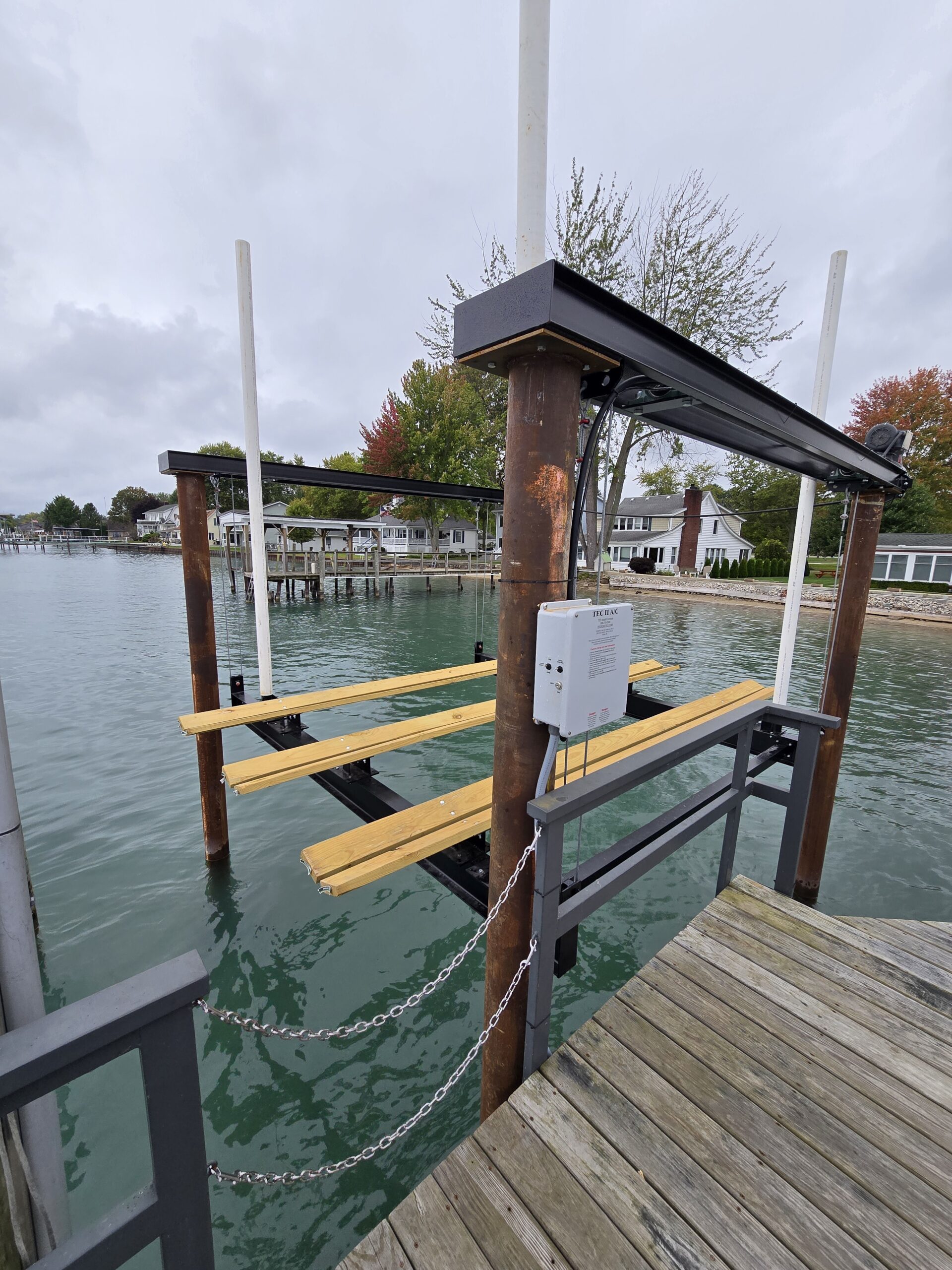 The hoist features a streamlined single-control operation and comes equipped with a remote and automatic limit switches for both the upper and lower ranges of travel. An isolation control toggle allows precise leveling of the front and rear cradle, while the adaptable design fits seamlessly into most boat well or cut-in well configurations. Its adjustable cradle system can be outfitted with either V-pads or beam rails, complemented by a PVC-covered bumper for added protection.